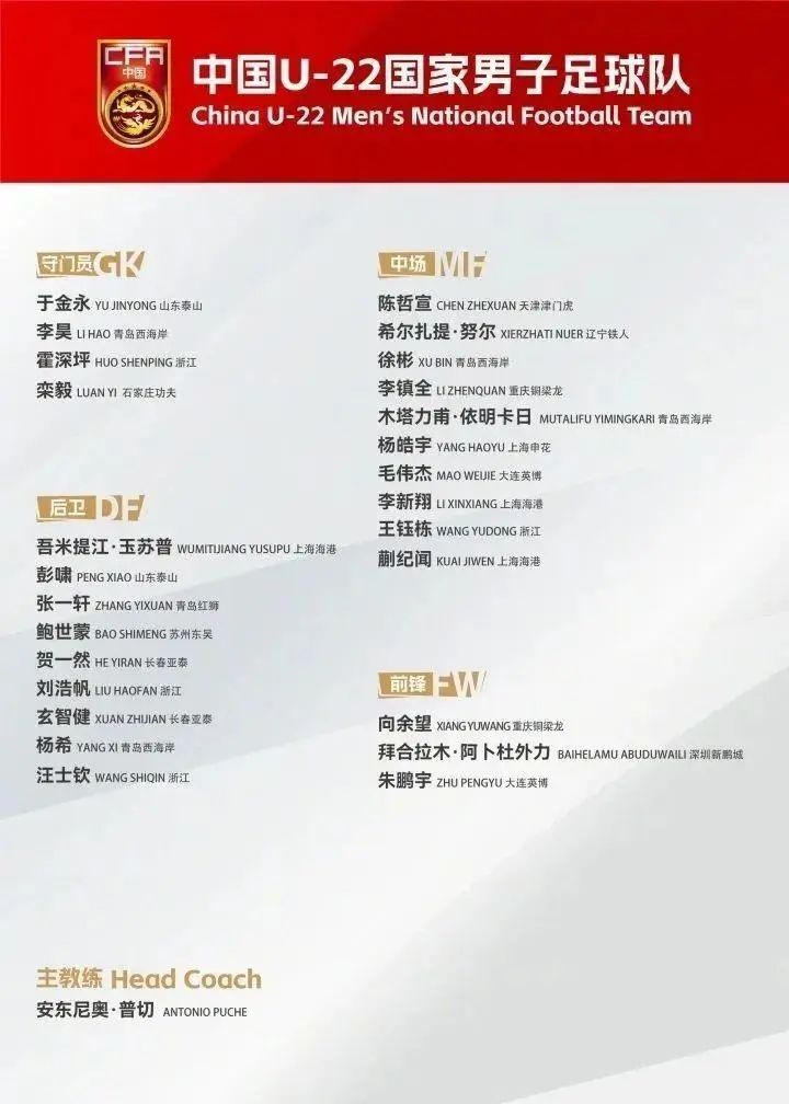 23日,中国足球队公布了中国U22国家男子足球队的新一期大名单,球队将于8月25日至9月10日赴陕西省西安市组织集训并参加U23亚洲杯预选赛。