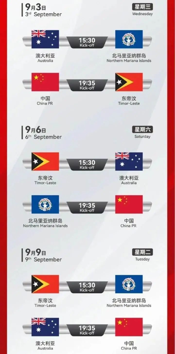 预选赛的抽签结果此前已经出炉,中国队与澳大利亚、东帝汶和北马里亚纳群岛同处D组,比赛将于9月3日至9月9日在西安进行,具体赛程如下: